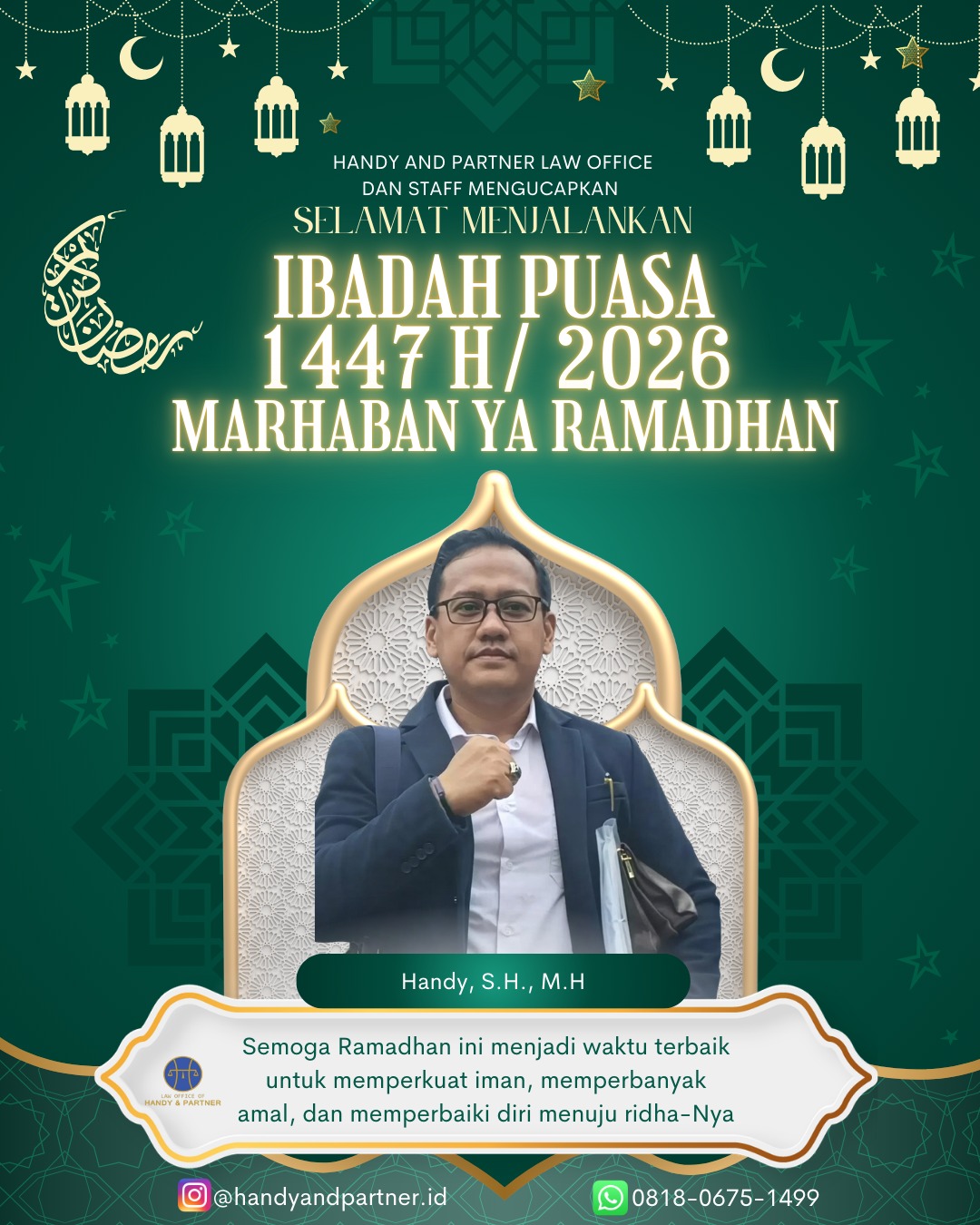 “Kami dari tim advokat mengucapkan Marhaban Ya Ramadhan. Semoga di bulan suci ini kita diberikan kesehatan dan kekuatan dalam menjalankan ibadah puasa,” ujar Handy.